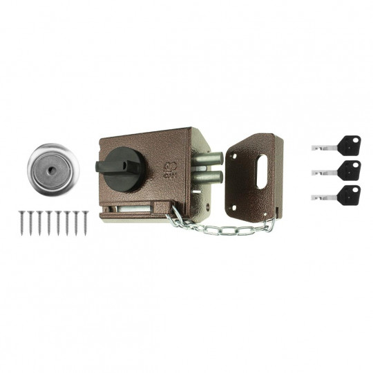 Замок накладной дисковый с предохранительной цепочкой. Предназначен для запирания дверей толщиной 35-45 мм. Выпускается отдельно на правые и на левые двери. Направление открытия – левое.