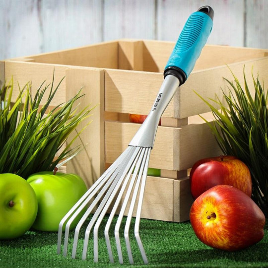 Веерные грабли предназначены для аэрация почвы и сбора листьев на садовых участках. Оснащены 9 зубцами, изготовленными из пружинной стали. Рукоятка с рифленой поверхностью не скользит в ладони.
