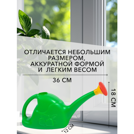 Компактность. Лейка для цветов маленькая не занимает много места: её удобно хранить в шкафу, кладовке или даже на полке рядом с растениями. Габариты (360×120×180 мм) делают её идеальной для домашнего использования.