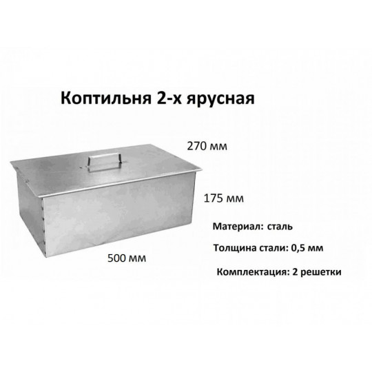 С помощью переносной коптильни «Кедр» 500x270x140мм (габариты с ручкой 500x270x175мм), сталь 0.8мм, легко и просто в любых условиях приготовить высококачественный, очень вкусный продукт. Используйте коптильню дома, на даче, на рыбалке, в походе. Коптите рыбу, дичь, мясо или сало и получайте удовольствие от самостоятельно приготовленных деликатесов! Переносная коптильня «Кедр» - отличный подарок для всех, кто любит вкусно поесть и хочет удивлять и радовать друзей лакомством собственного производства. Пользоваться коптильней легко и просто любому человеку, даже очень далекому от кулинарии. В качестве источника тепла может служить костер, бытовая или переносная газовая плита и т. п. В качестве источника дыма рекомендуются опилки или мелкие стружки лиственных пород древесины (дуб, ольха, яблоня, вишня, груша и т. п.).