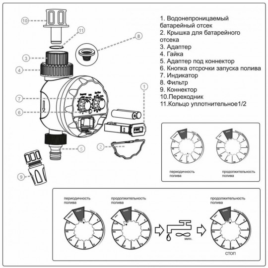 Механический таймер, работающий от двух батареек, позволит вам не только выбрать интервал, через который будет осуществляться полив, но и его длительность. Таймер надежно защищен от осадков закручивающейся крышкой.