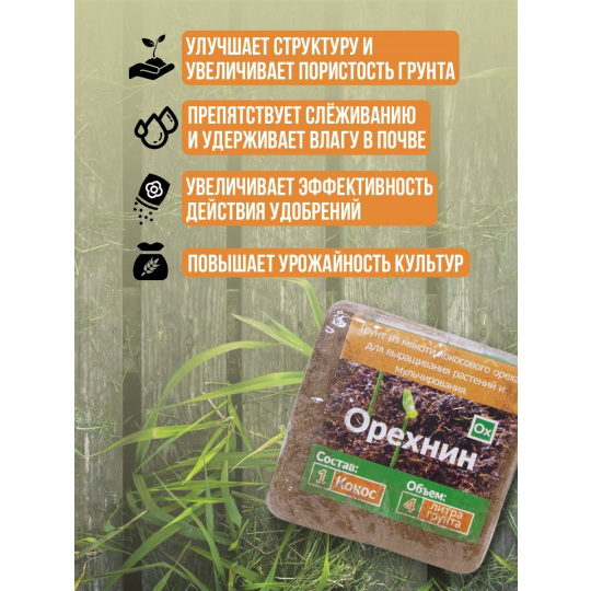 Грунт из мякоти кокосового ореха для выращивания растений и мульчирования. 100% кокос (мелкая фракция).Экологически чистая натуральная добавка в почву с уникальными свойствами.Поместите брикет в ёмкость, постепенно добавьте 9-10 л воды. Через 15 минут грунт готов к применению!Преимущества:- улучшает структуру и увеличивает пористость грунта;- препятствует слёживанию и удерживает влагу в почве;- увеличивает эффективность действия удобрений;- повышает урожайность культур.Назначение:- мульчирование; готовый Орехнин рассыпьте слоем 1-7 см.- нейтрализация патогенной микрофлоры; используйте для хранения луковичных цветов и корней саженцев, а также при проращивании и укоренении.- стимулирование развития корневой системы; при посадке внесите под корни 0,5 - 3 литра готового Орехнина.- выращивание растений; готовый Орехнин смешайте с обычной землей в пропорции 1:3 соответственно.