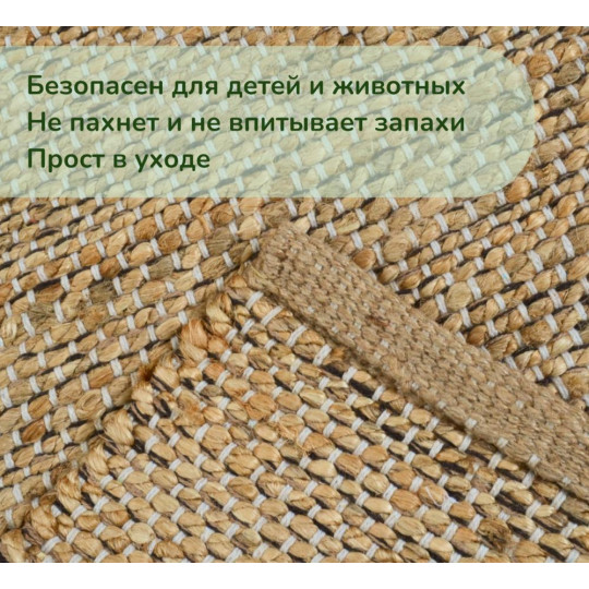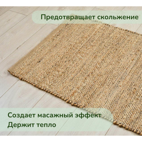 Ковер из джута с добавлением хлопка (65% джут, 35% хлопок) мягкий на ощупь и обладает приятным массажным эффектом. Тканый ковер можно постелить в гостиной, зале возле дивана или кресла, использовать как прикроватный в спальне, на кухне, в прихожей. С помощью коврика-циновки можно создать стильную атмосферу на балконе и веранде загородного дома.