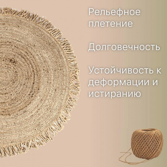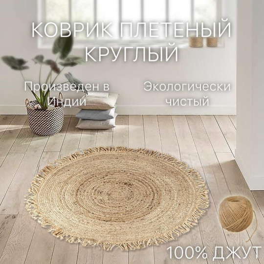 Эко-коврик выполнен из плетеной джутовой нити – это натуральный материал из кустарника джут, он очень прочный, практичный и износостойкий, поэтому изделия подходят для любых помещений. Тканый ковер можно постелить в гостиной, зале возле дивана или кресла, использовать как прикроватный в спальне, на кухне, в прихожей. С помощью коврика-циновки можно создать стильную атмосферу на балконе и веранде загородного дома.