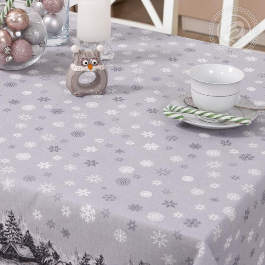 «Сочельник скатерть» – настоящая зимняя сказка на рогожке. Завораживающие и волшебные пейзажи с деревенскими избами и заснеженными елями будто нарисованы грифельным карандашом на сером холсте. Смотришь на самобытный рисунок и вспоминаются строки Александра Пушкина о красоте русского пейзажа. Простая и в то же время изящная рождественская композиция сделает праздник уютным и по-семейному теплым.