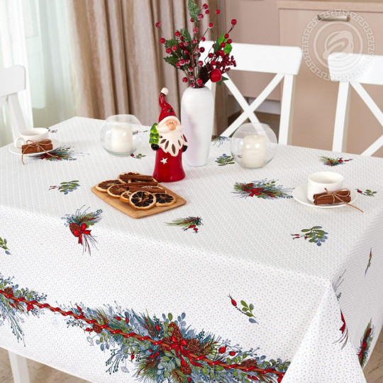 «Антураж» – новогодняя скатерть из рогожки с оригинальными деталями. Композиция включает в себя все праздничные элементы: еловые веточки с красными лентами, шишками и ягодами.