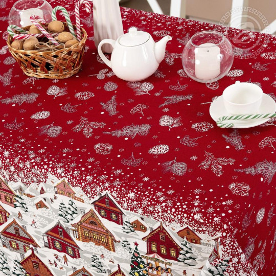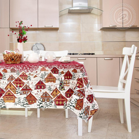 Вы ждете Новый год? Тогда Вам точно понравится новогодняя скатерть с великолепным пейзажем. Здесь изображен маленький городок с зимними улочками из деревянных изб, пушистыми ёлками и снежинками. Этот авторский дизайн окутывает нежностью и ностальгией. Хочется попасть в этот волшебный мир и почувствовать себя героем чудесной сказки.