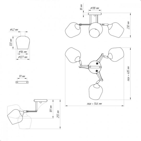 Изготовленная из стекла и металла, она обеспечивает яркое освещение благодаря стеклянным плафонам, которые мягко рассеивают свет от традиционных ламп накаливания до 60 Вт или экономичных светодиодных ламп до 15 Вт.