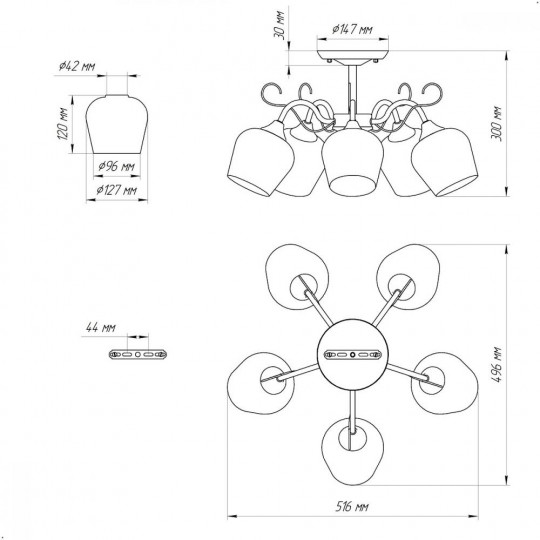 Изготовленная из стекла и металла, она обеспечивает яркое освещение благодаря стеклянным плафонам, которые мягко рассеивают свет от традиционных ламп накаливания до 60 Вт или экономичных светодиодных ламп до 15 Вт.