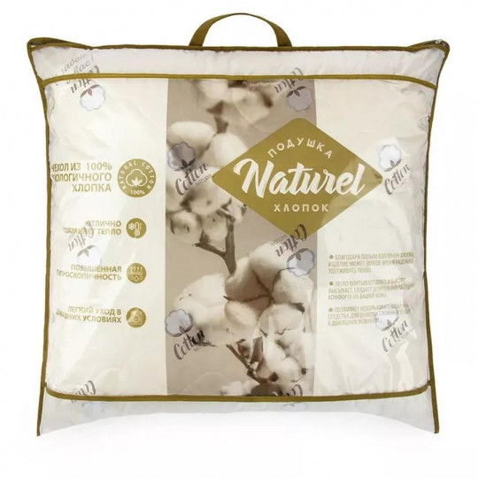 Хлопок экологичен, гигроскопичен, обладает отличными теплоизолирующими свойствами, что делает его идеальным при использовании в производстве постельных принадлежностей. Чехол подушки Хлопок коллекции «Naturеl» изготовлен из простеганного полотна, верхний слой - 100% хлопок, подстёжка – хлопковое волокно. Наполнитель подушки – легкое и нежное гипоаллергенное полиэфирное волокно.