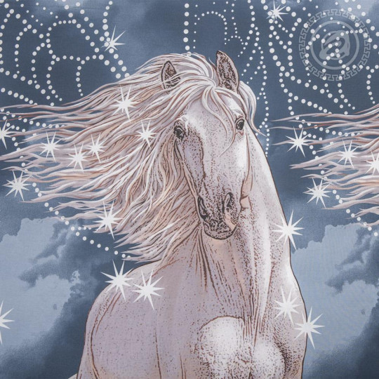 Пегас изображен в динамике: он летит сквозь облака, широко расправив крылья. На фоне изображено бескрайнее небо, которое дополняет общий рисунок и придает принту нотки фэнтезийной романтики.