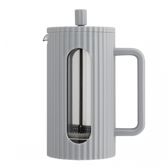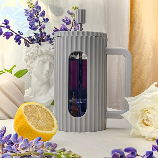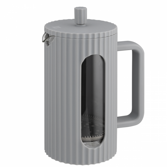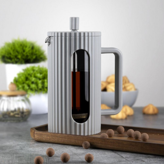 Колба выполнена из боросиликатного стекла, устойчивого к перепадам температур. Удобная ненагревающаяся ручка. Корпус выполнен из безопасного пищевого пластика (РР), цвет - серый, поверхность - матовая, поверхность корпуса и крышки - ребристая. Пресс выполнен из высококачественной нержавеющей стали. Разборная конструкция пресс-фильтра облегчает уход за изделием. Стеклянная колба защищена надежным пластиковым корпусом, что обеспечивает практичное и безопасное использование посуды. Идеален для приготовления кофе, чая, тонизирующих и расслабляющих напитков.