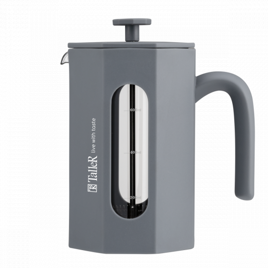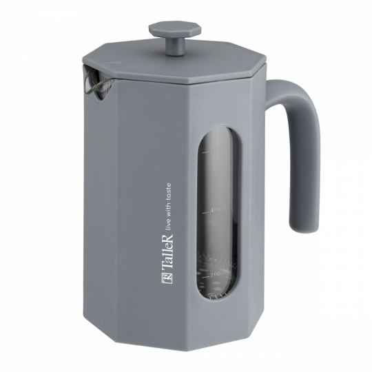 Колба выполнена из боросиликатного стекла, устойчивого к перепадам температур. Удобная ненагревающаяся ручка. Корпус выполнен из безопасного пищевого пластика (РР), цвет - серый, поверхность - матовая. Пресс выполнен из высококачественной нержавеющей стали. Разборная конструкция пресс-фильтра облегчает уход за изделием. Стеклянная колба защищена надежным пластиковым корпусом, что обеспечивает практичное и безопасное использование посуды. Идеален для приготовления кофе, чая, тонизирующих и расслабляющих напитков.