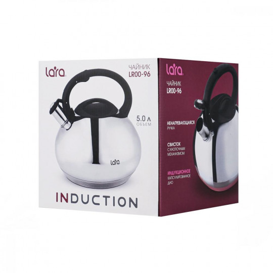 Вместительный чайник LARA LR00-96 – гармоничное сочетание стиля и функциональности. Чайник изготовлен из нержавеющей стали и отличается повышенной прочностью. Эргономичная ручка не нагревается, обеспечивая комфорт и безопасность во время использования. Чайник оснащен свистком, который сообщит о закипании воды. Для удобства свисток имеет кнопочный механизм. Съемная крышка позволит легко очистить и наполнить чайник. Индукционное капсулированное дно подходит для всех типов плит.