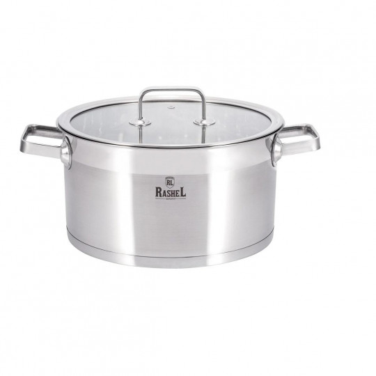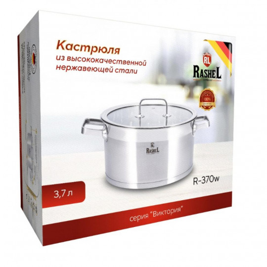 Кастрюли торговой марки RASHEL выполнены из высококачественной нержавеющей стали. Кастрюли удобны в использовании, за ними легко и просто ухаживать. Многослойное капсульное дно равномерно распределяет тепло и долгое время сохраняет достигнутую температуру, тем самым обеспечивает равномерный нагрев и равномерную подачу тепла во внутрь кастрюли.
