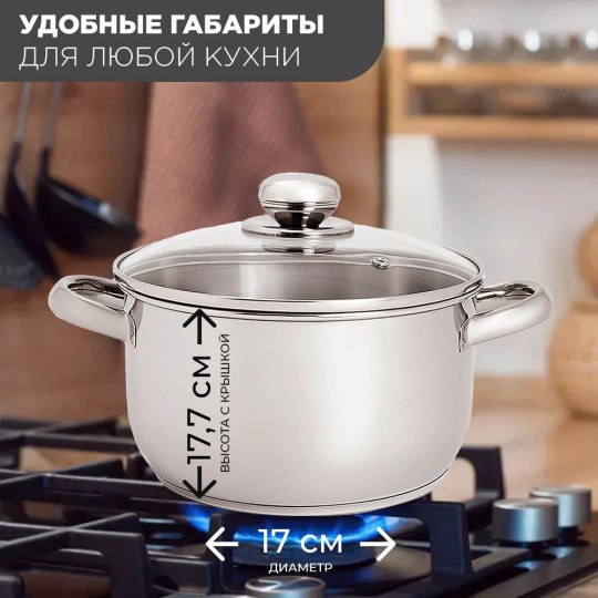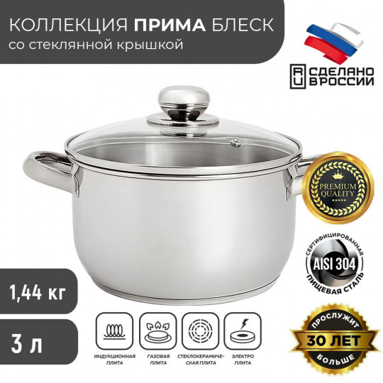 Кастрюля «Прима» (Блеск) 3 л, Ø200 мм с ТРС – это плавные линии, зеркальная поверхность, разнообразие предметов и объёмов, качество, безопасность и безупречный долгий срок службы.