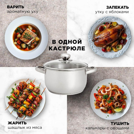 Посуда имеет зеркальную полировку, которая способствует более легкому уходу за изделием, а так же зеркальный блеск придаст интерьеру кухни новый стиль..