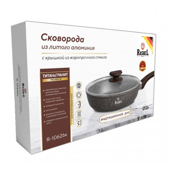 Сковороды ТМ RASHEL выполнены из высококачественного пищевого алюминия. Внутреннее и внешнее сверхпрочное, гранитное, антипригарное покрытие ТИТАН&ГРАНИТ.