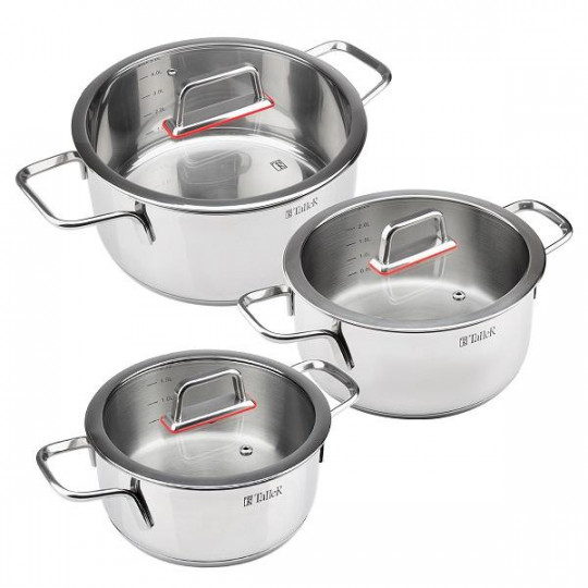кастрюля 2,0 л с крышкой 18*8,8 см кастрюля 2,8 л с крышкой 20*9,8 см кастрюля 5,0 л с крышкой 24*11,8 см Толщина стенки - 0,6 мм, толщина дна - 2,8 мм. Капсулированное дно для лучшего распределения тепла. Полировка зеркальная внутри и снаружи. Плоские крышки из жаропрочного стекла со стальным ободом с отверстием для выхода пара. Ручки из нержавеющей стали на точечной сварке. Есть отметки литража. Подходит для всех типов плит (включая индукционную). Пригоден для мытья в посудомоечной машине. Нельзя использовать в духовом шкафу.