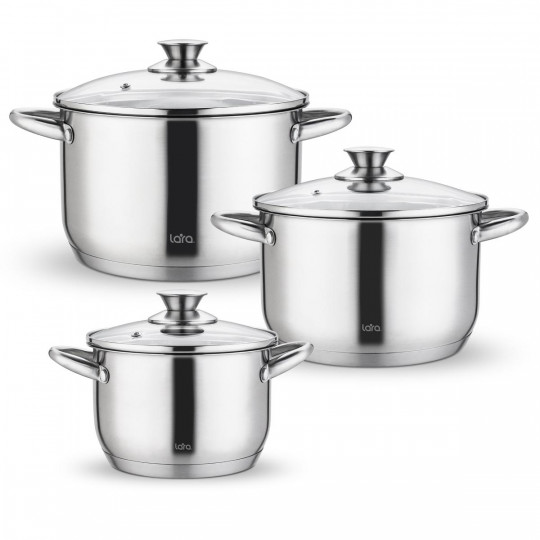 Набор посуды LARA серии Афина – посуда премиум-класса для ценителей качества и надежности. Кастрюли выполнены из нержавеющей стали и отличаются высокой прочностью. Толстое пятислойное капсулированное дно обеспечивает равномерный нагрев и длительное сохранение тепла, предотвращая подгорание пищи. Все кастрюли оснащены крышкой из жаропрочного стекла. Наши изделия подходят для всех видов плит, включая индукционные, и совмещают в себе современный дизайн и удобство эксплуатации. Мы подобрали оптимальное сочетание литражей в одном наборе, чтобы вы могли наслаждаться готовкой с посудой Lara.
