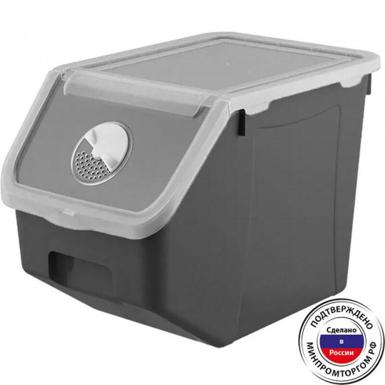Крышка оснащена вентиляционными отверстиями на подвижном клапане, которые обеспечивают естественную циркуляцию воздуха в контейнере и отвод избытка влаги.