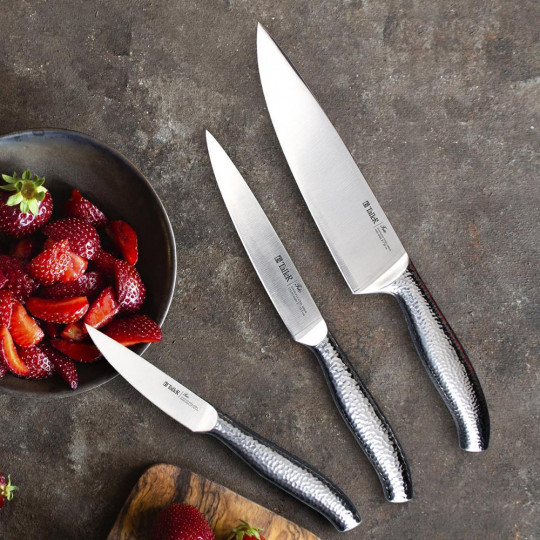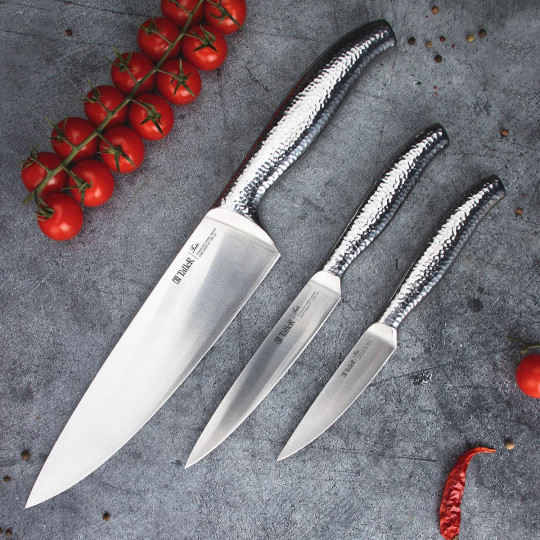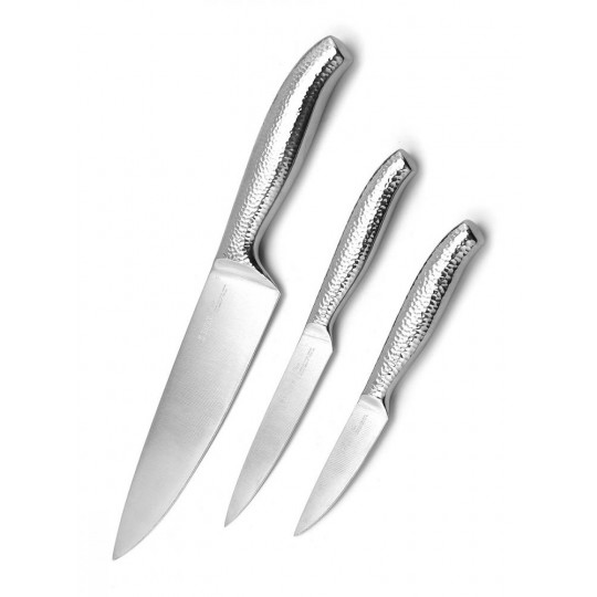 Лезвия ножей сделаны из твердой коррозионностойкой стали AISI 420S45. Облегченные стальные рукоятки. Узор на рукоятках создает небольшую ребристую поверхность, приятную на ощупь.