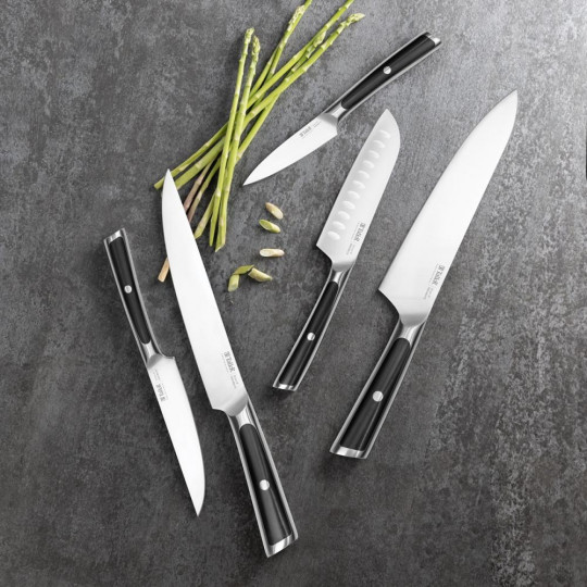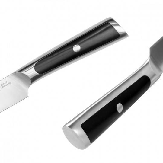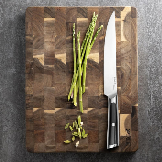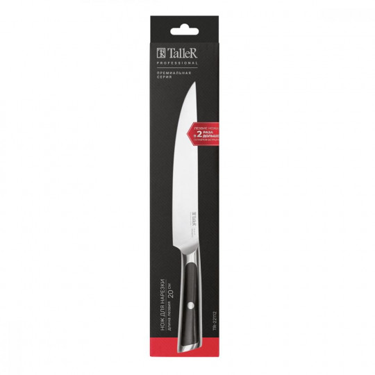 Нож для нарезки TalleR TR-22112 Professional, лезвие 20 см подходит для нарезки овощей, фруктов и зелени, сырого и вареного мяса, разделки курицы и рыбы. Длина лезвия – 20 см. Толщина лезвия - 2,3 мм. Лезвие выполнено из легированной стали X50CrMoV15, которая отличается высокой твёрдостью, длительным сроком службы и повышенной стойкостью к коррозии. Твердость по шкале Роквелла 56–57 HRC. Режущая кромка лезвия ножа устойчива к притуплению. Рукояти выполнены из прочного ABS-пластика. Используйте для заточки точильные камни, мусаты, ножеточки. Рекомендуется ручная мойка.