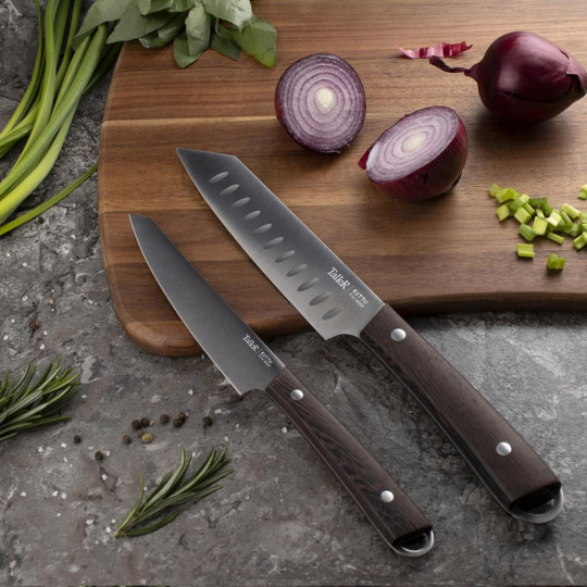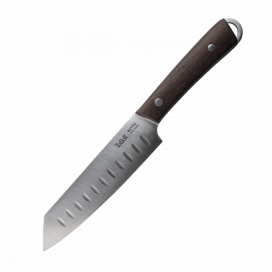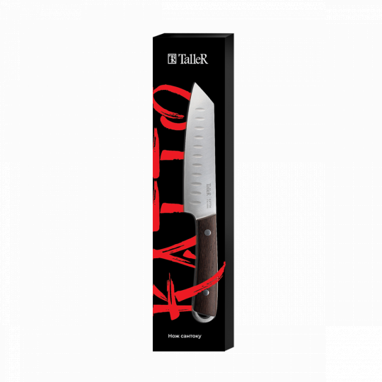 Нож сантоку TalleR TR-22054 Катто подходит для нарезки мяса, рыбы или овощей. Длина лезвия - 15 см, ширина лезвия - 3,6 см, толщина лезвия - 2,3 мм. Длина ножа – 28 см. Лезвие ножа сделано из высококачественной нержавеющей стали AISI 420S45. Ручка выполнена из нержавеющей стали и дерева венге. Есть отверстие для подвешивания.