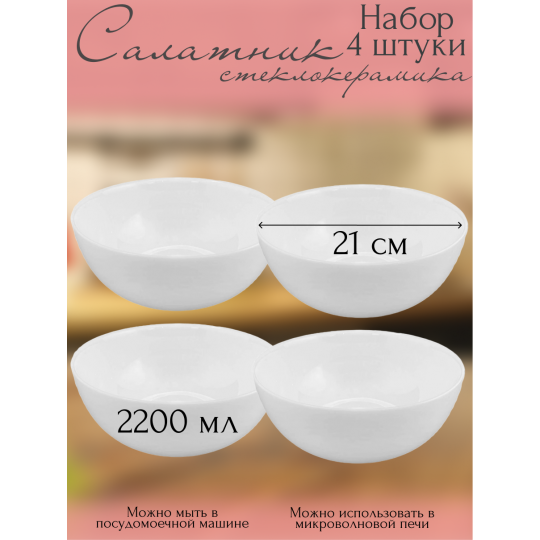 В комплекте: 4 салатника, диаметр — 21 см, объём — 2200 мл.
