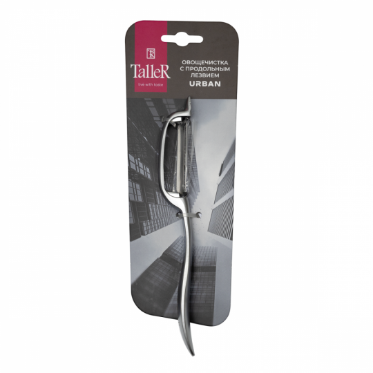 Овощечистка с продольным лезвием TalleR TR-65126 выполнена из цинкового сплава. У изделия никелированная матовая поверхность. Размер: 17 х 2,2 х 1,9 см. Режущий элемент сделан из высококачественной нержавеющей стали. Длина лезвия - 4 см.