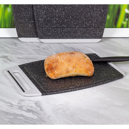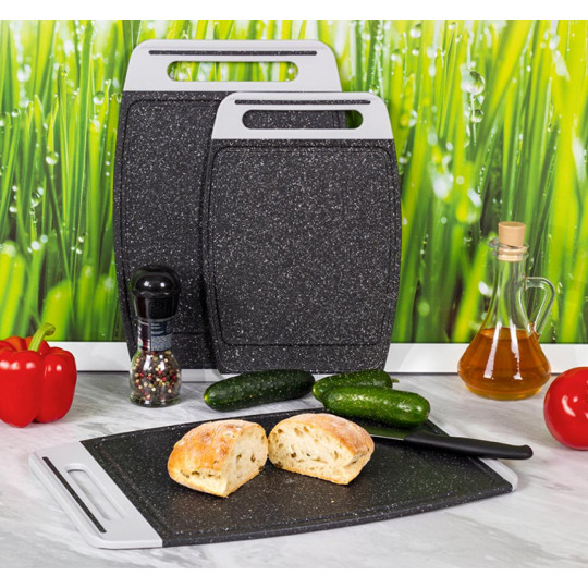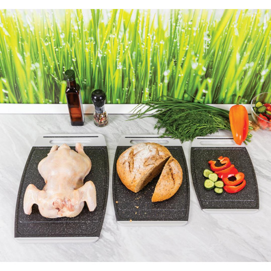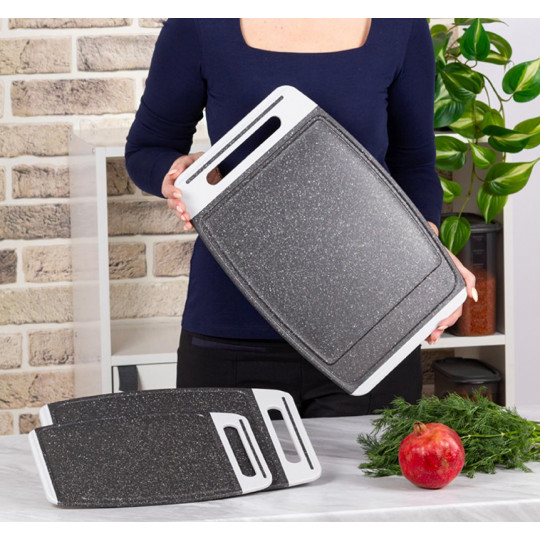 Большой размер и толщина, удобные ручки, антискользящие вставки, долговечный и износостойкий материал, желобки для отвода влаги и сока – это важные преимущества, которые обеспечивают комфортные условия для нарезки любых продуктов.