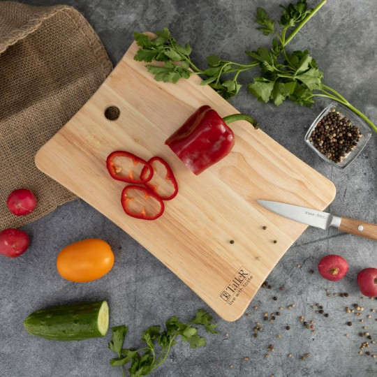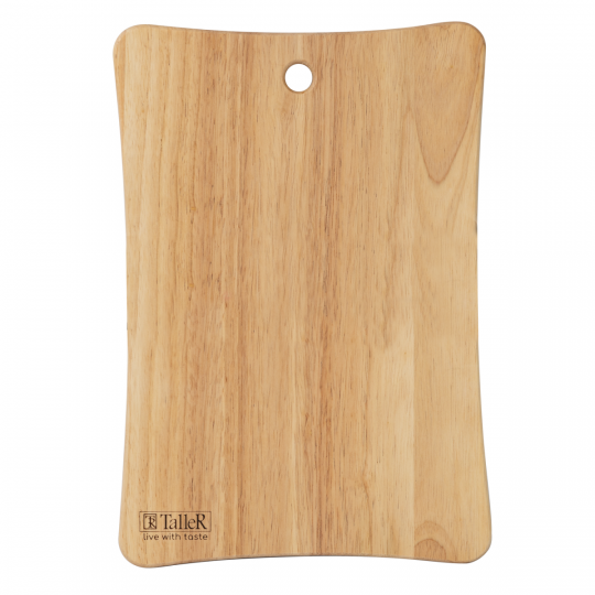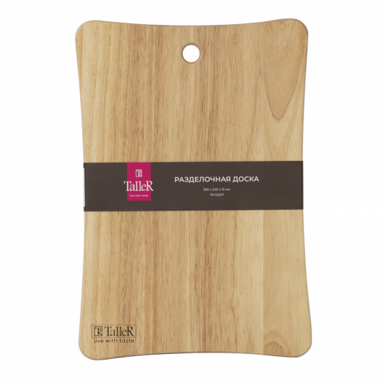 Доска разделочная TalleR TR-52227 выполнена из гевеи. Древесина гевеи обладает высокой прочностью и износостойкостью. Благодаря наличию в структуре дерева натурального каучука, который скрепляет волокна, посуда из гевеи устойчива к влаге, не впитывает запахи, обладает абсолютными антибактериальными свойствами. Гладкая и приятная на ощупь поверхность натурального дерева, его выразительная текстура в бежево-молочных оттенках, качественное исполнение изделий – все это принесет удовольствие от использования. Легко использовать и ухаживать: достаточно помыть в теплой воде и аккуратно вытереть полотенцем. Есть отверстие для подвешивания, чтобы хранить доску на рейлинге (диаметр - 1,8 см).