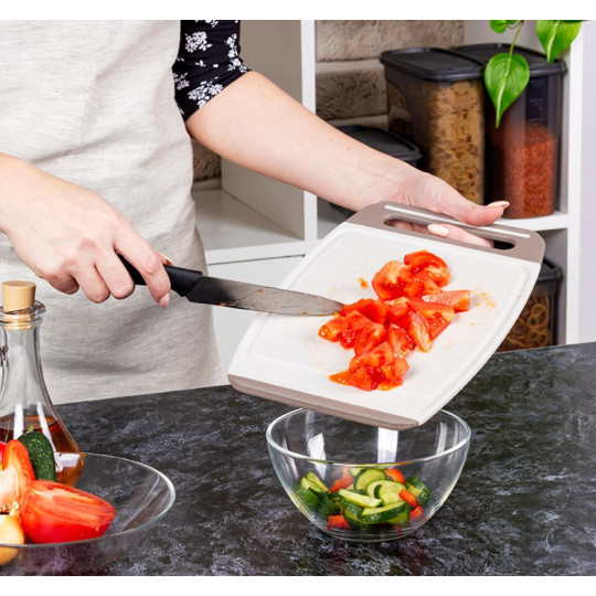 Большой размер и толщина, удобные ручки, антискользящие вставки, долговечный и износостойкий материал, желобки для отвода влаги и сока – это важные преимущества, которые обеспечивают комфортные условия для нарезки любых продуктов.