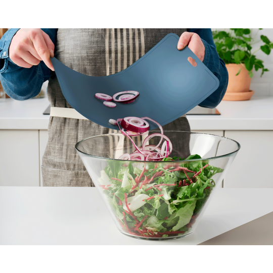 Гибкая доска макси идеально подойдёт для разделки мяса, рыбы, крупных овощей и теста. Её эластичная поверхность легко принимает нужную форму, позволяя одним движением направить нарезанные продукты прямо в ёмкость. А после использования — можно повесить доску за специальное отверстие на крючок, чтобы она всегда была под рукой и не занимала место на столешнице.