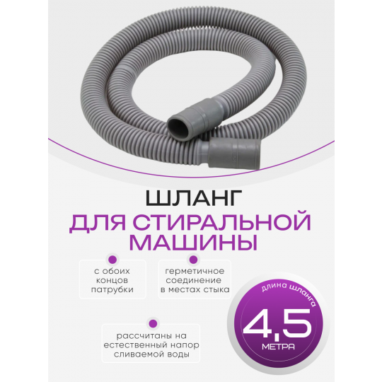 Водяной шланг для стиральной машины разработан с учетом современных стандартов качества и безопасности. Благодаря оптимальной длине, сливной шланг для стиральной машины 4,5 метра идеально подходит для подключения к любой системе канализации.
