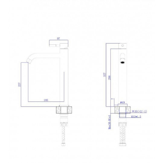 В смеситель установлен картридж D-35 с керамическими пластинами. Высота смесителя 327мм. Излив литой неповоротный 185мм., высота излива до аэратора 227мм. Аэратор изготовлен из пластика с нержавеющим корпусом, угол наклона аэратора- 7 гр.