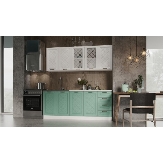 Кухня Агава – изящный гарнитур с фрезеровкой по фасаду и матовыми стёклами.