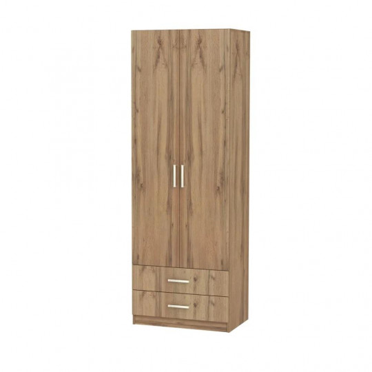 Корпус шкафа Феникс М-6 выполнен из ламинированной ДСП высокого качества с насыщенным цветом. За распашными дверьми штанга для одежды с одной стороны и стеллаж с полками с другой. Внизу расположены два выдвижных ящика.