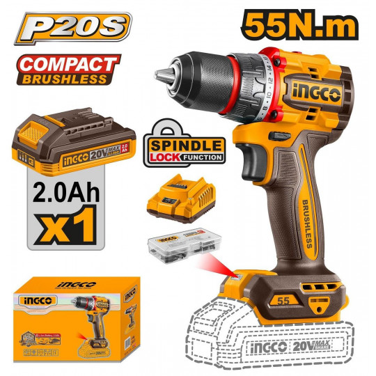 Аккумуляторный бесщеточный шуруповерт INGCO CDLI205582 20В 55Нм предназначен для сверления отверстий в пластике, древесине, металле, закручивания саморезов, винтов и прочих крепёжных элементов при сборке мебели, монтаже различных конструкций, выполнении ремонтных, строительных и отделочных работ как внутри зданий, так и на улице. Защита от перегрузки гарантирует длительный срок эксплуатации. Защита от перегрева продлит срок службы изделия. Светодиодная LED-подсветка для более комфортной работы при плохом освещении. Блокировка шпинделя для быстрой замены оснастки.