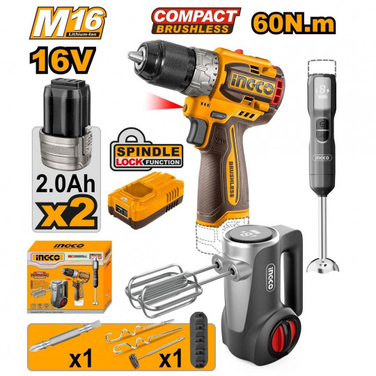 Набор аккумуляторного инструмента 16В BL 60Hm 2хАКБ 2Ач и ЗУ + блендер 100Вт + миксер 125Вт INGCO CKLI1638 включает в себя Шуруповёрт, Блендер, Миксер.
