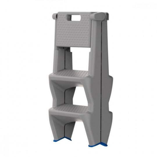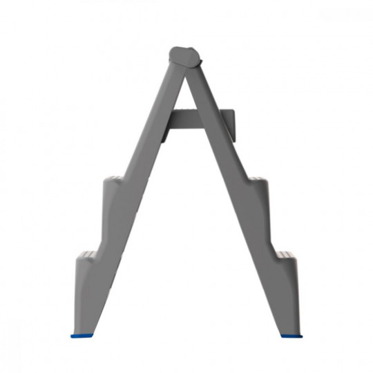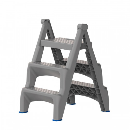 Продукт исполнен из усиленного полипропилена. Крепкая и долговечная конструкция предназначена для усилия до 150 кг. Широкие ступени глубиной 110 мм, а так же верхняя ступень 200 мм делают подъем комфортным. Специальный узор на ступенях предотвращает скольжение стопы, делает подъем и спуск безопасным. Опоры из прочного нескользящего пластика обеспечивают устойчивое положение. Ступени с двух сторон позволяют работать не переставляя стремянку, тем самым экономя время.