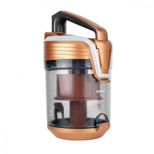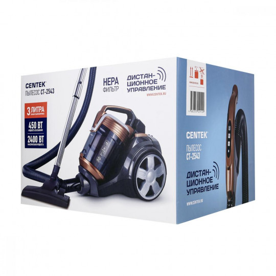 Безмешковой пылесос CENTEK CT-2543 в компактном корпусе. Сочетает в себе мощный мотор 450 Вт (мощность всасывания) и увеличенный контейнер для мусора 3 л, что позволяет производить полноценную уборку еще комфортнее и эффективнее. Данная модель оснащена трехуровневой системой фильтрации задерживающая до 99.9% частиц пыли. Дистанционное управление пылесосом осуществляется клавишами, которые вынесены на ручку.